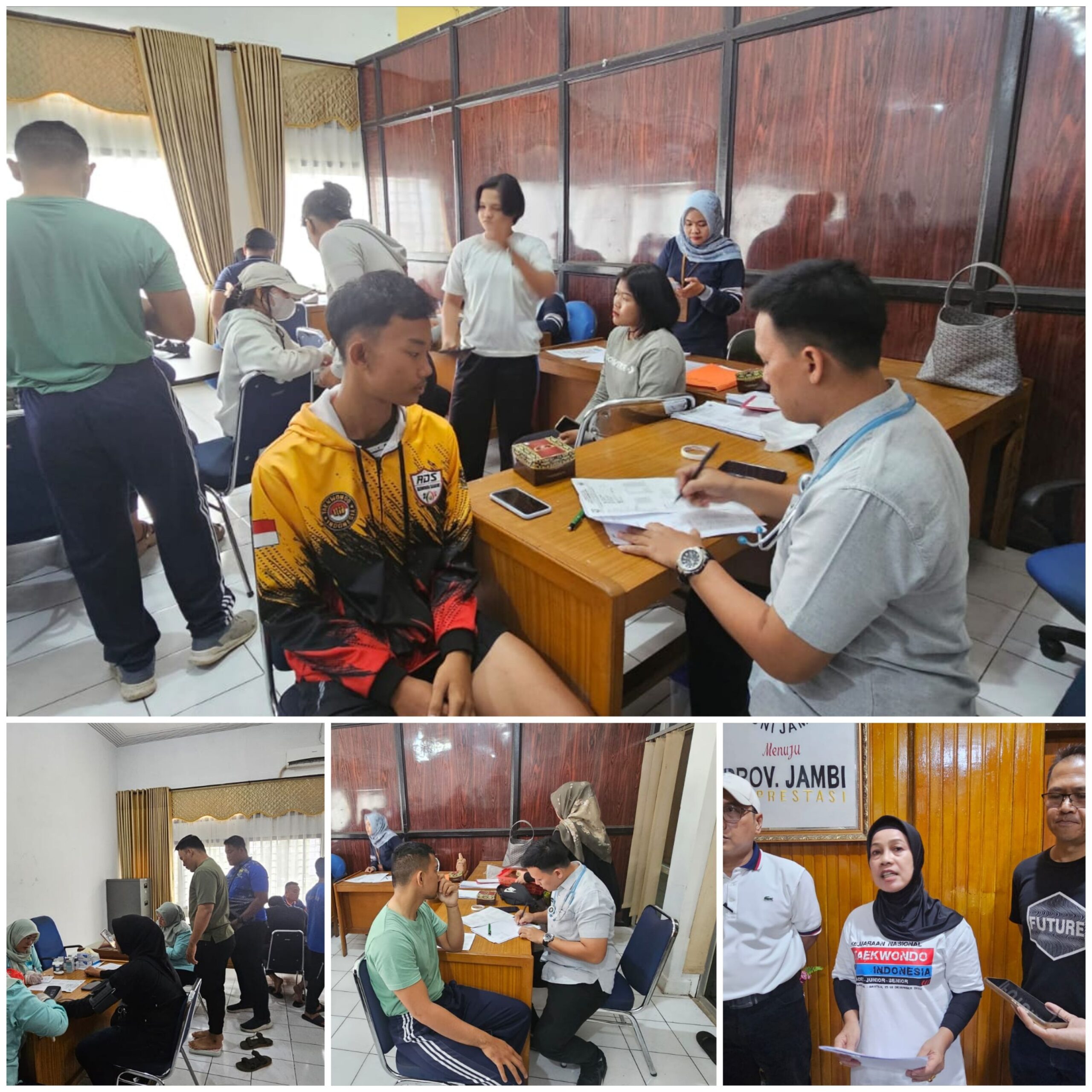 Para atlet bela diri jalani tes kesehatan di Aula KONI Provinsi Jambi dalam rangka persiapan menuju PON Bela Diri di Kudus, Jawa Tengah pada Oktober 2025.