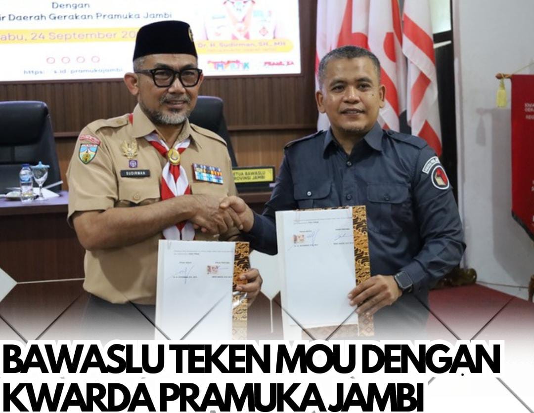 Jambi – Guna membangun sinergitas dan memperkuat kerja sama, Bawaslu Provinsi Jambi melakukan penandatanganan nota kesepahaman atau Memorandum of Understanding (MoU) dengan Kwarda Gerakan Pramuka Jambi yang dilakukan oleh Ketua Bawaslu Provinsi Jambi Wein Arifin, S.IP., M.IP dan Ketua Kwarda Gerakan Pramuka Jambi Dr. H. Sudirman, S.H., M.H berlangsung di Kantor Kwarda Gerakan Pramuka Jambi Kotabaru Kota Jambi, Rabu (24/09/2025).